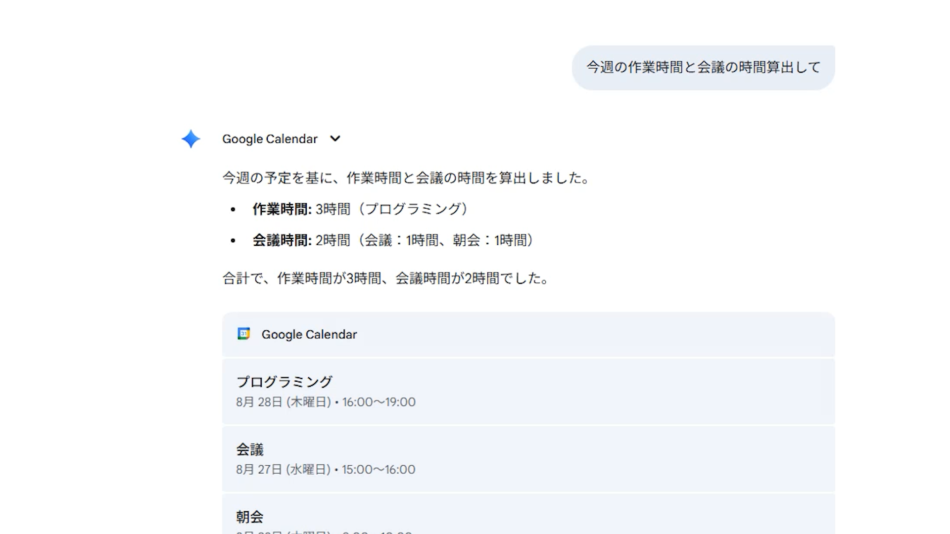 これでGemを選択して「今週の教えて」と入力すれば、それぞれの時間を算出してくれるようになりました。