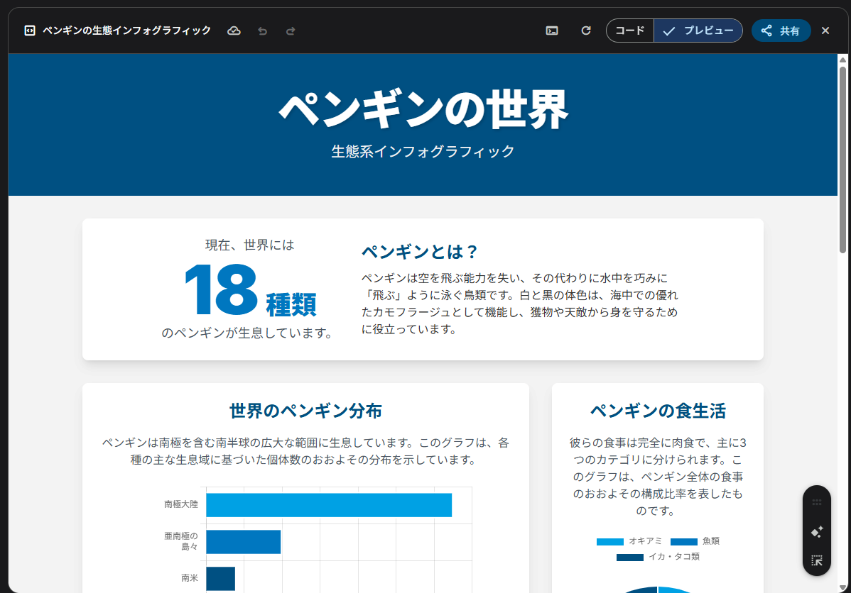 作成されたものの右上から作成ボタンを押してインフォグラフィックを選択すると、図形を用いた資料を作ってくれます。